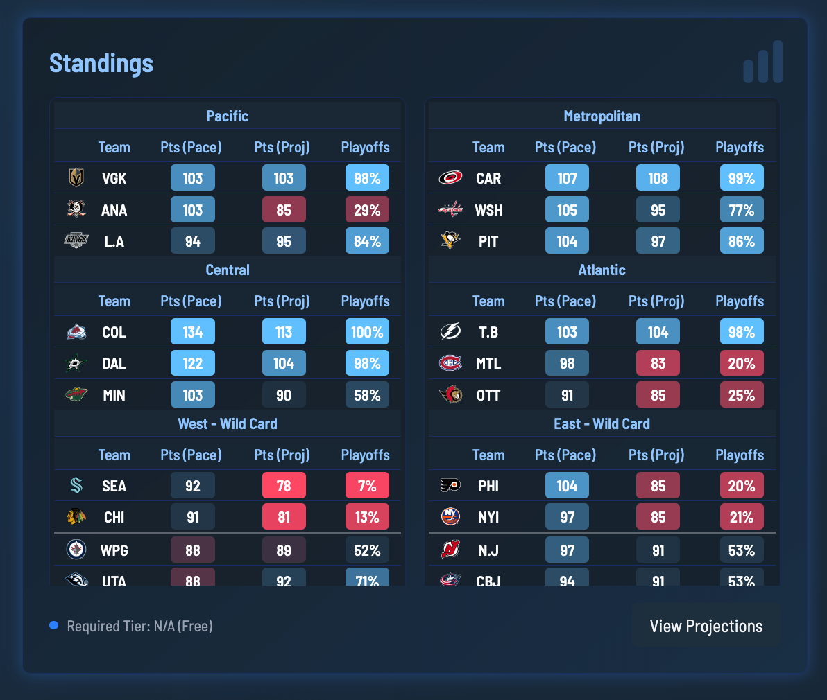 Standings Projections: The TopDown standings projection model is there on the home page, and maybe more importantly it also shows the full current standings by 82-game pace which you can’t find anywhere else.