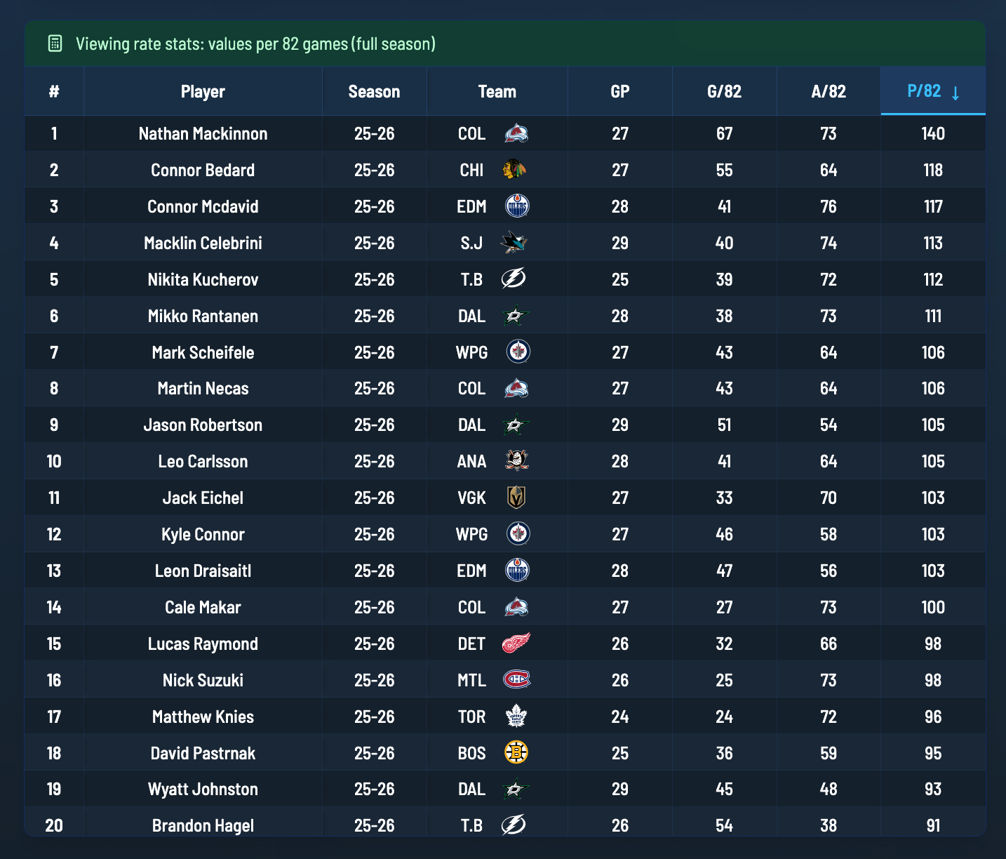 Stat Tables: The stat tables are fully up and stocked with 2025-26 data, with one particular feature that you won’t find anywhere else which is per 82 GP numbers. This means you can check out player point pace without having to do the math yourself.