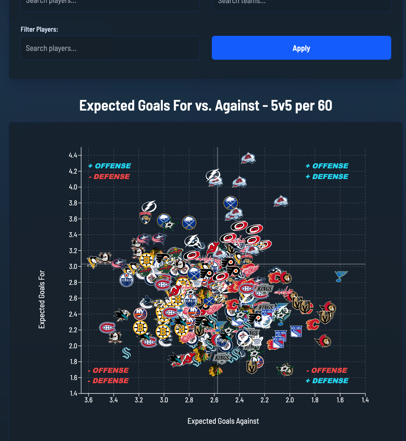 Dashboards: This is a big one for me - we are finally free of Tableau! Patrick has essentially replicated our suite of interactive scatterplot dashboards for teams and skaters as well as a bar graph of goals saved above expected.