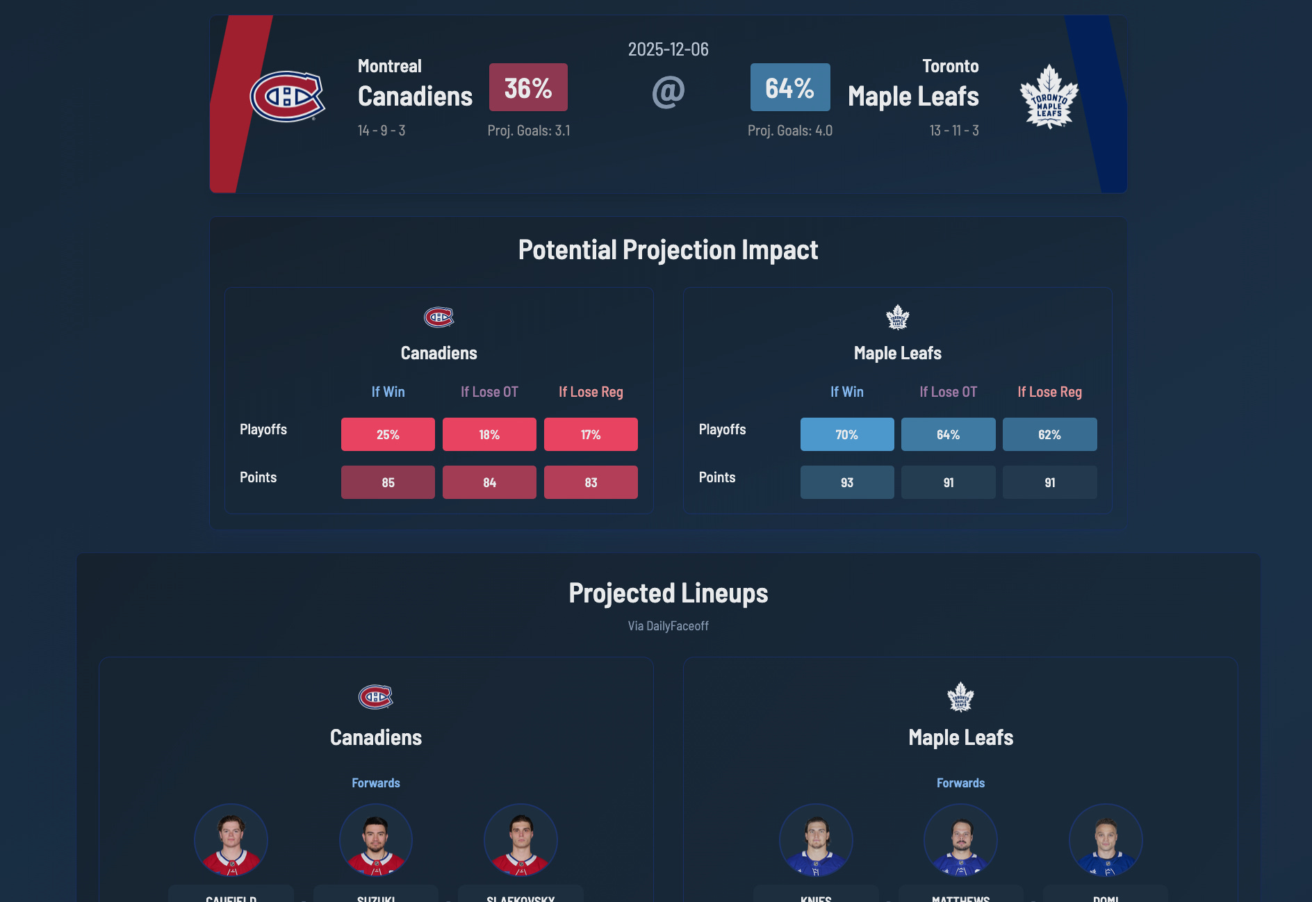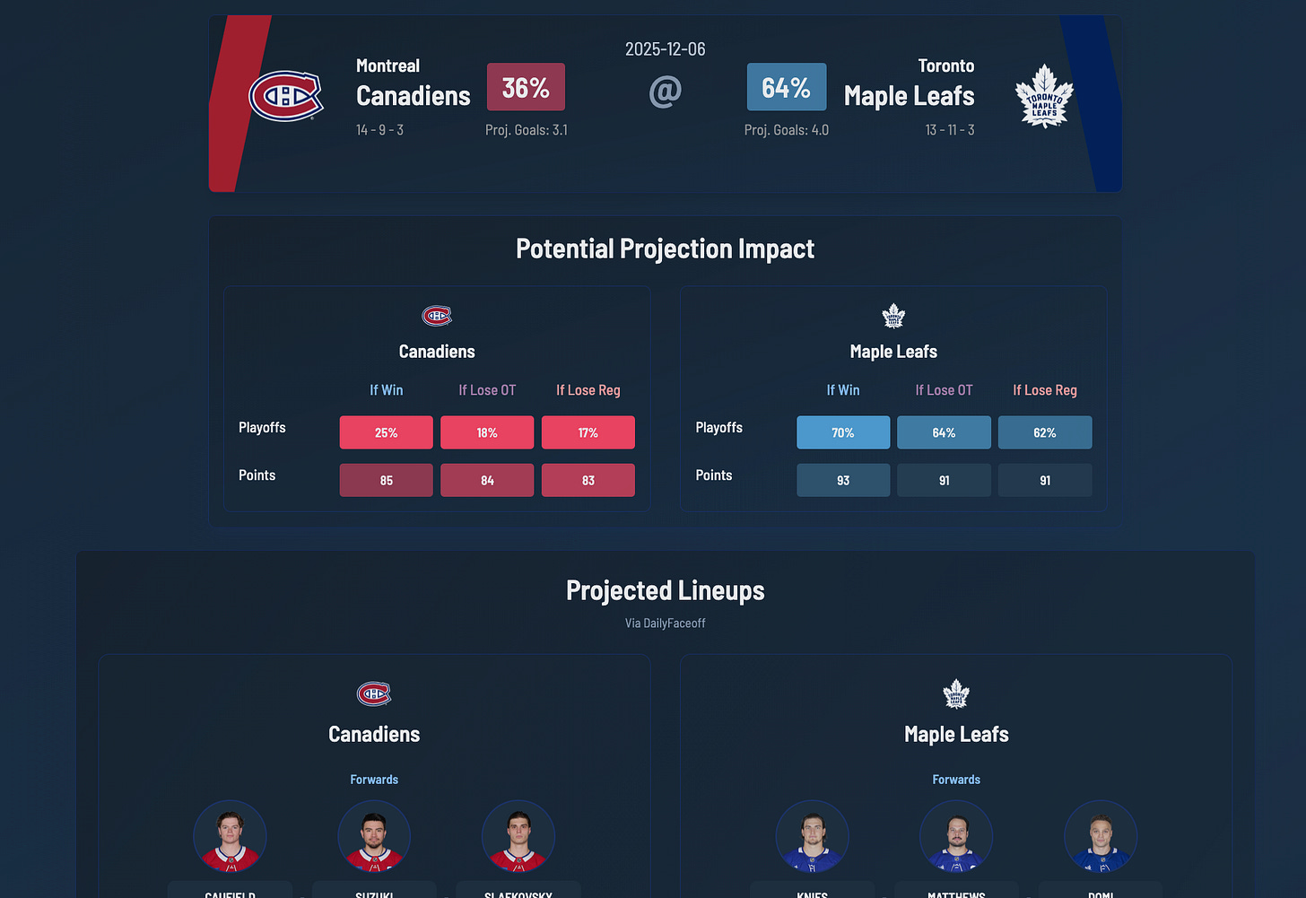 Game Projections: The top bar of the site now features the NHL schedule as well as percentage projections for each game. Clicking on the game allows you to see full projected lineups, projected goals, head-to-head team ranking comparisons, and the impact that each game outcome will have on each team’s playoff chances and point projection. Here’s a sample game.