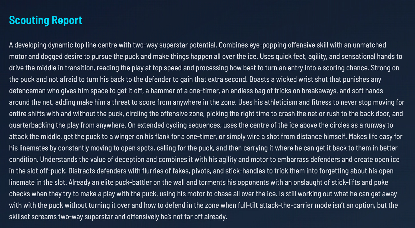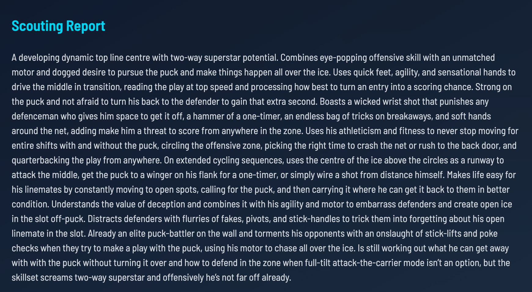 Scouting Reports: This has been in the works for a while. It has always bugged me that you can find mountains of eye-test-based information on every fifth round pick but almost none on actual established NHL players. That’s going to change. For about the past year, I have been carefully watching all of the league’s most relevant players and digging through all types of data to write 100- to 400-word summaries of their games that do not explicitly reference any stats whatsoever. These reports describe what they’re good at, what their weaknesses are, and how they play the game. They’re not uber-technical (no references to ankle flexion), but they will give you a bite-sized understanding of how they play the game that you couldn’t find anywhere else. I’ve also been validating these reports with people who cover the respective teams to make sure they line up and that I haven’t missed anything. As of right now, I have written around 200 forward reports and 75 defenceman reports and the total word count is almost 37,000. I am aiming to have these on the site by January 1, with more added and updated as the season goes along. Here’s an example, Macklin Celebrini’s: