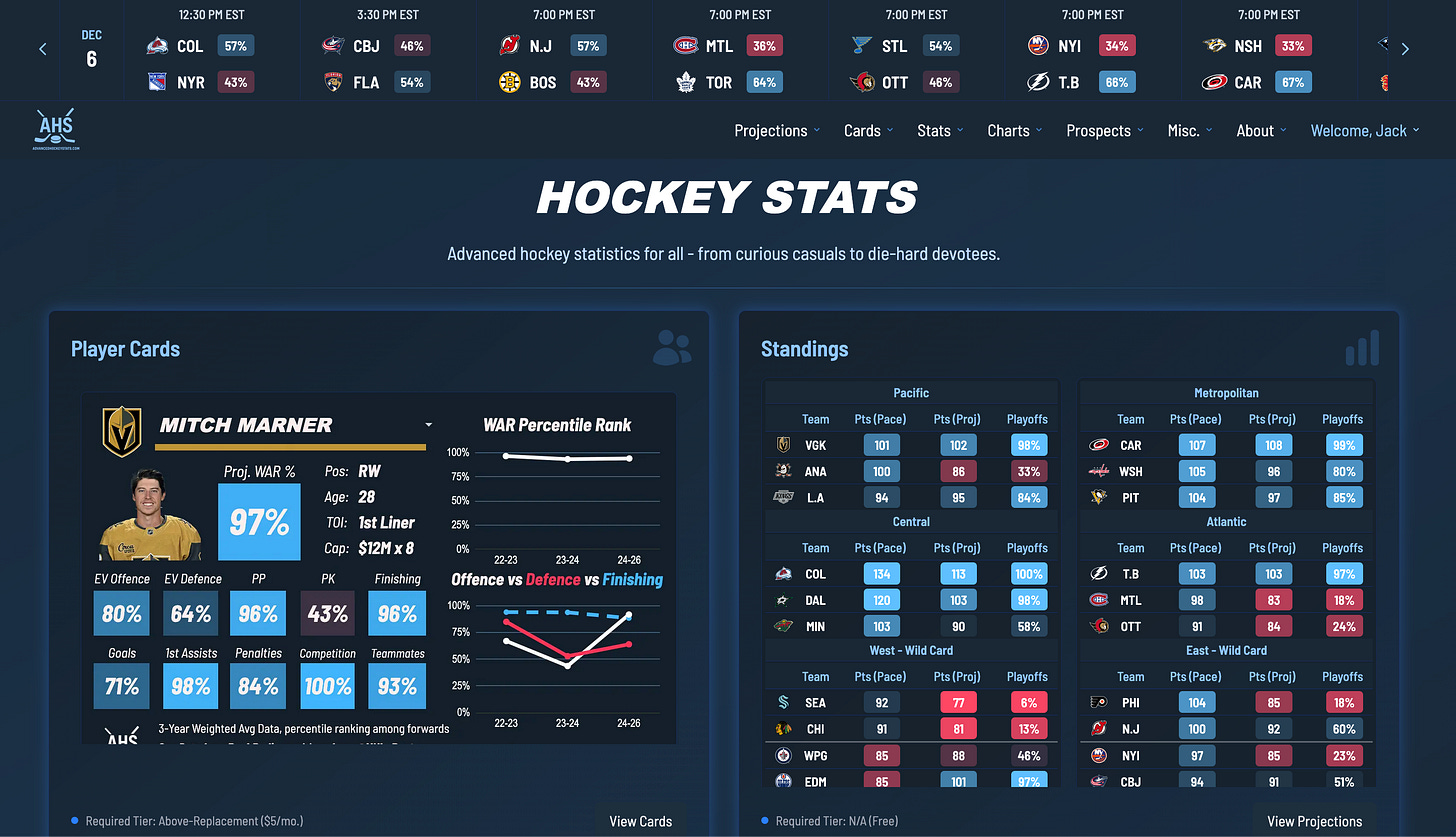 As you might be aware, we launched our official website a few months ago. It’s the home to all our stats as well as player + team cards and plenty of other stuff both free to access and exclusive to subscribers. Since then, Patrick’s been working incredibly hard to build up the features to make the site your home for hockey stats.